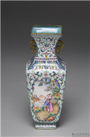 铜胎。长方形瓶,敞口,收颈,颈上有云形双耳,硕腹向下微歛,圈足。全器以白色为地,器腹阔面各有开光,内绘提篮西洋仕女与吹号角随从,远方有远山湖水与城堡,双面图案对称,开光外满饰花卉,窄边腹加绘八吉祥,颈肩与圈足有变形蕉叶纹,全器鲜艳多彩,色彩明度高。器内施湖蓝色釉,底有双方框红书楷款「乾隆年制」。有木座。
