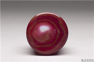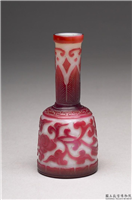 玻璃。此花插以白色料为底,套以紫红色料。口沿一圈折边,直长颈,直圆腹。颈琢蕉叶纹等,腹琢卷枝花叶纹。底刻「大清乾隆年制 露」款。与另一件料花插成对。