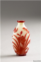器物典藏-清 乾隆 玻璃套料花卉纹鼻烟壼 Glass overlay snuff bottle with bamboo and orchids design.