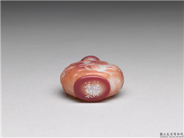 玻璃,通体乳白色,套饰淡粉红色玻璃。扁瓶形,卷唇,圆腹,圈足。器身饰桃实、灵芝、蝠、花等吉祥纹饰。底刻有「乾隆年制」四字款。缺盖。