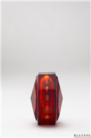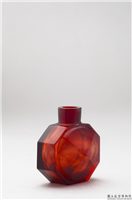 玻璃,透明深红色。瓶形,直口,短颈,器腹作扁八角式,腹两面皆雕有四扇形组成之椭圆形开光,中央尖如锥。全器光素。缺盖。
