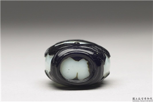 通体青白色不透明玻璃,套饰黑色玻璃之圈足及花鸟。带粉红碧玺盖及牙匙。