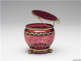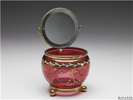 桃红色玻璃圆盒一组,呈束口椭圆腹与直壁两种形式。口沿镶金属扣,与平顶盖相连,底部镶金边及三足。椭圆盒顶盖内托镶玻璃镜一方,可供旋转照容。盒外壁以描金、白色珐琅彩绘花叶串饰。直壁盒盖顶与外壁以金彩绘饰环状飞羽纹饰。口沿周边各饰以金底白色草叶纹与金色双环。